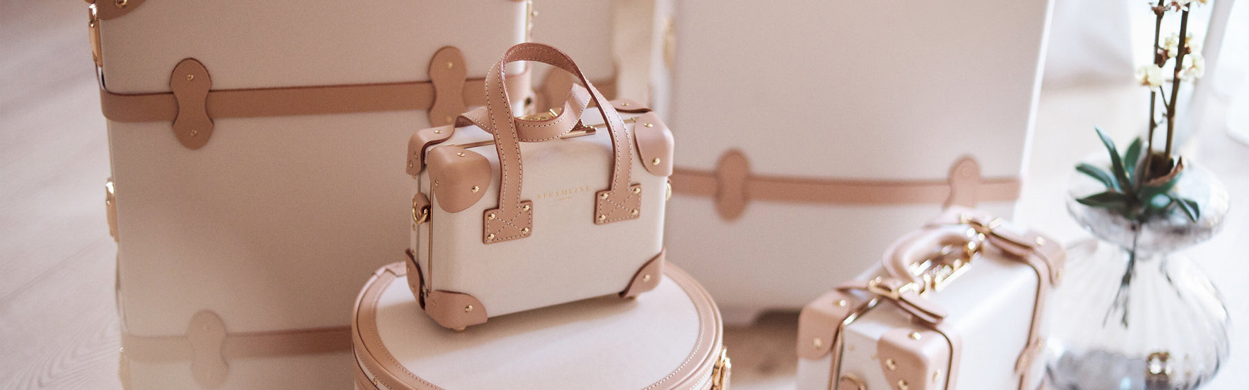 Our gorgeous white vintage suitcases with tan detailing are a timeless choice for travelers and trips of every nature. This chic white exterior features luxurious gold latches and opens to reveal an original SteamLine Print of whimsical birds, foliage, and flowers. Our most quintessential honeymoon collection is equally at home on sandy or snowy destinations and will enhance the romance of all life's adventures. Our gorgeous white vintage suitcases with tan detailing are a timeless choice for travelers and trips of every nature. This chic white exterior fea... Our gorgeous white vintage suitcases with tan detailing are a timeless choice for travelers and trips of every nature. This chic white exterior features luxurious gold latches and opens to reveal an original SteamLine Print of whimsical birds, foliage, and flowers. Our most quintessential honeymoon collection is equally at home on sandy or snowy destinations and will enhance the romance of all life's adventures.