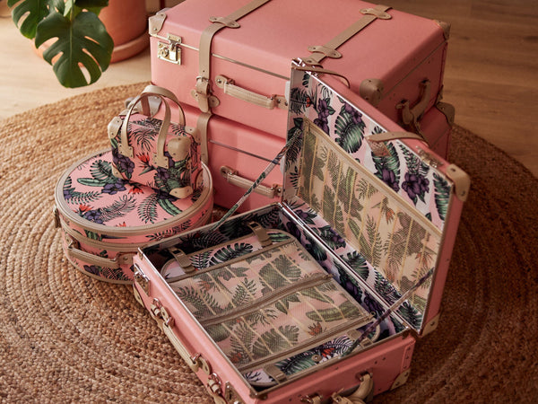 Inside, zippered lid pockets and a detachable door-hanger washbag in matching exotic-bird print aid your packing organisation.
